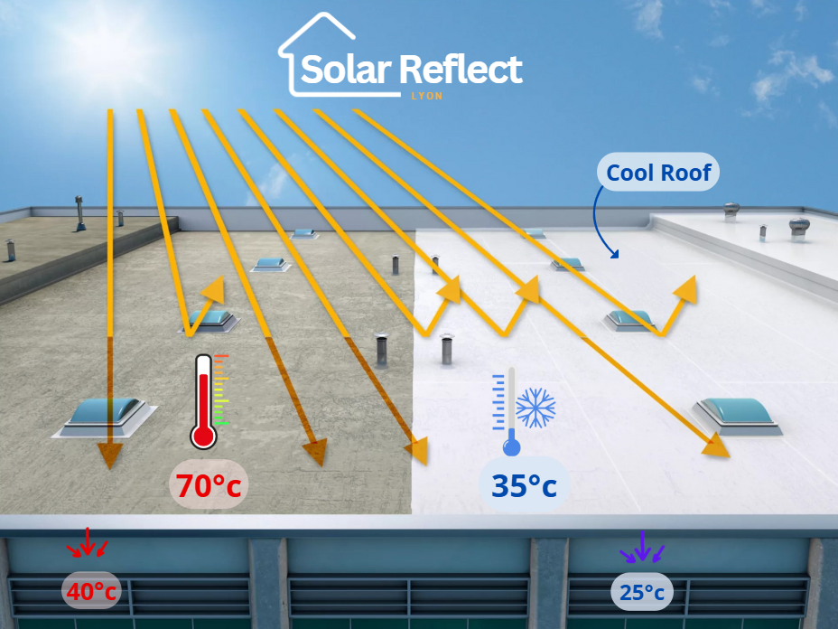 Vous cherchez une solution pour réduire la chaleur dans votre bâtiment à Lyon ? Le Cool Roof lyon Solar Reflect est une peinture réfléchissante haute performance qui diminue la température de votre toiture jusqu’à 8°C et réduit votre facture énergétique de 30 à 40%. Nous intervenons sur Lyon, Givors et toute la métropole pour les bâtiments résidentiels, commerciaux et industriels.